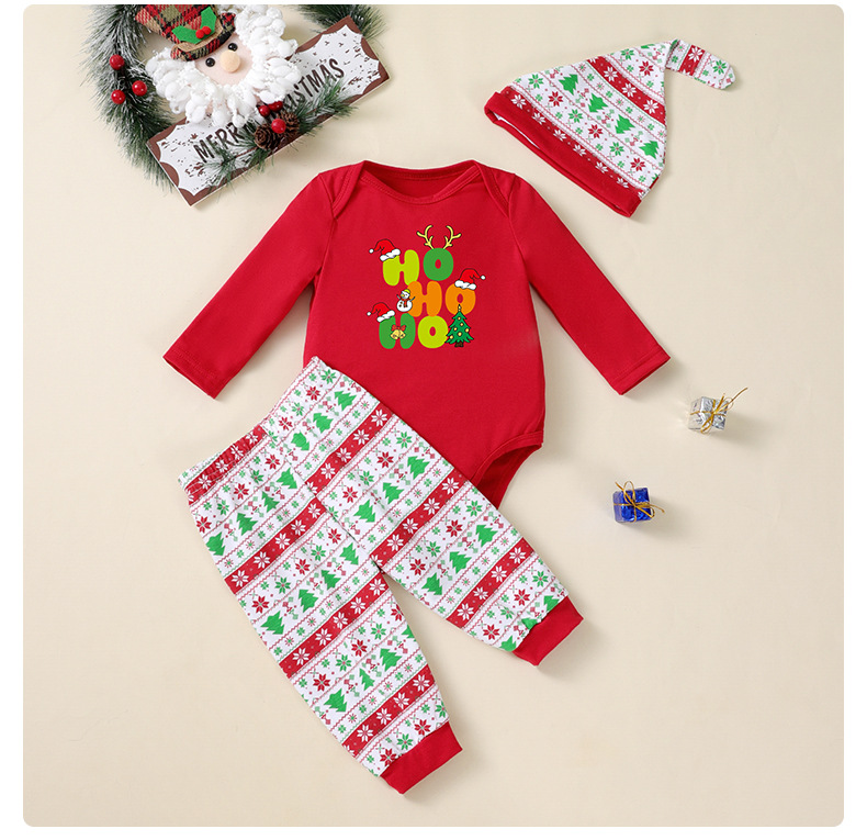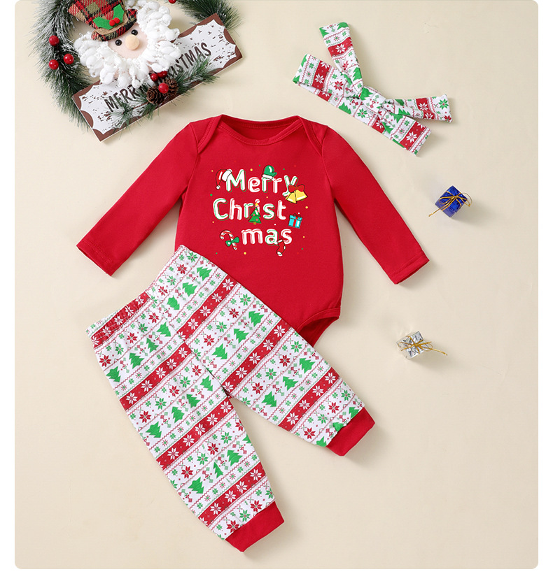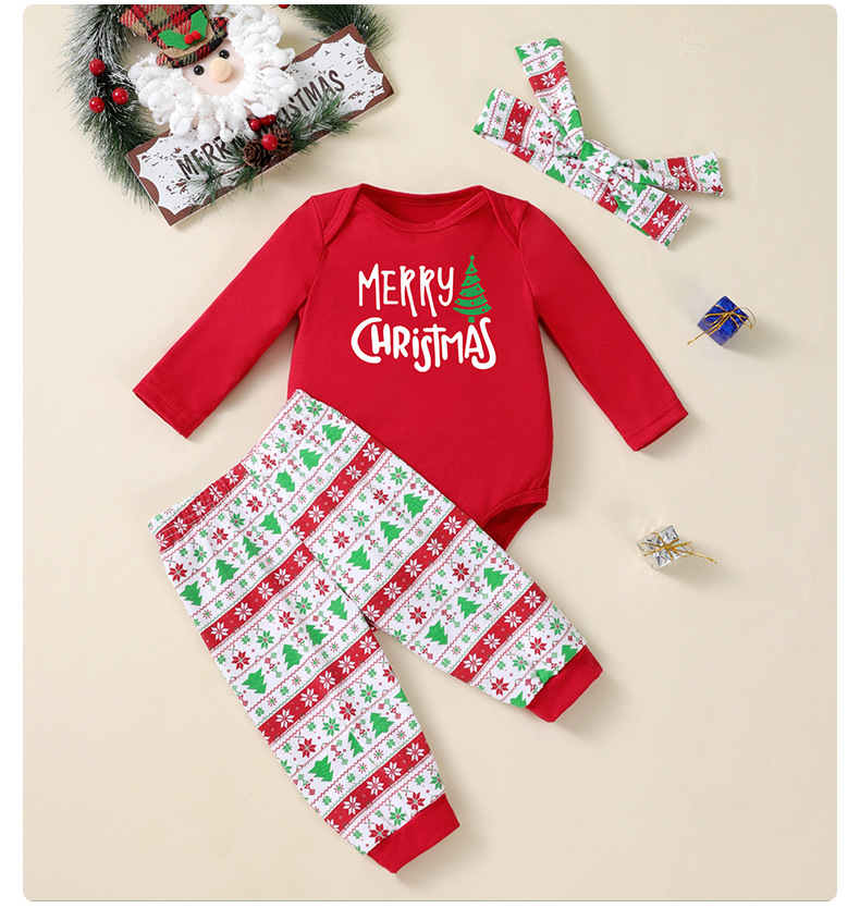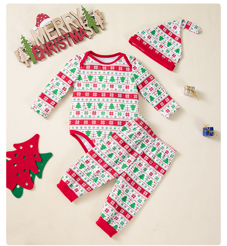 Christmas Tree Print Long-sleeve Bodysuit Pants Hat 3-piece Party Outfit