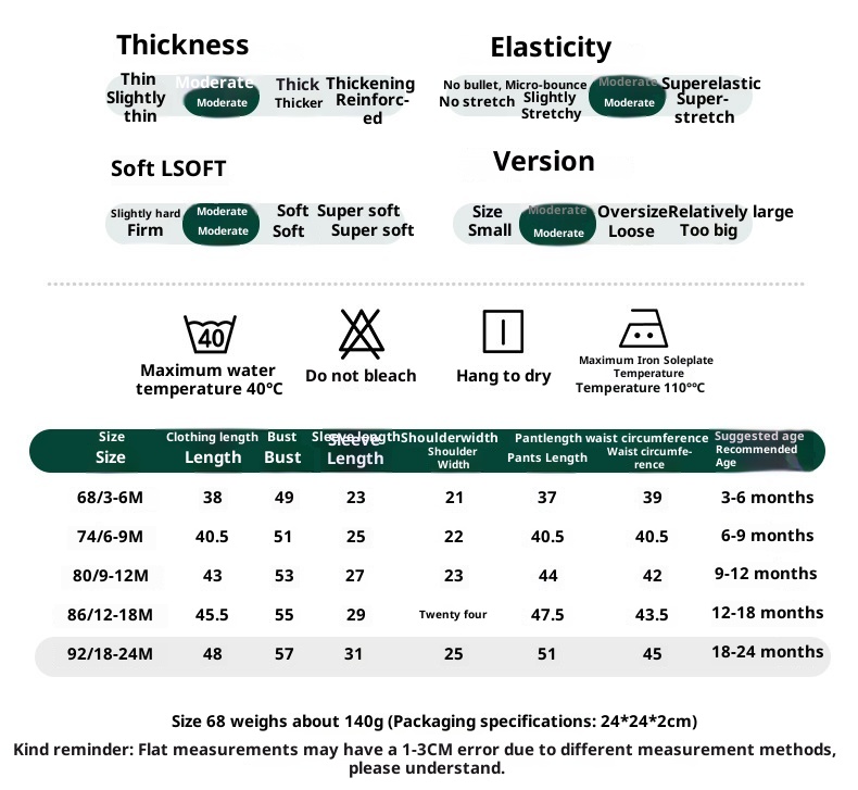 Suitable Height: 68 (3-6M), 74 (6-9M), 80 (9-12M), 86 (12-18M), 92 (18-24M)